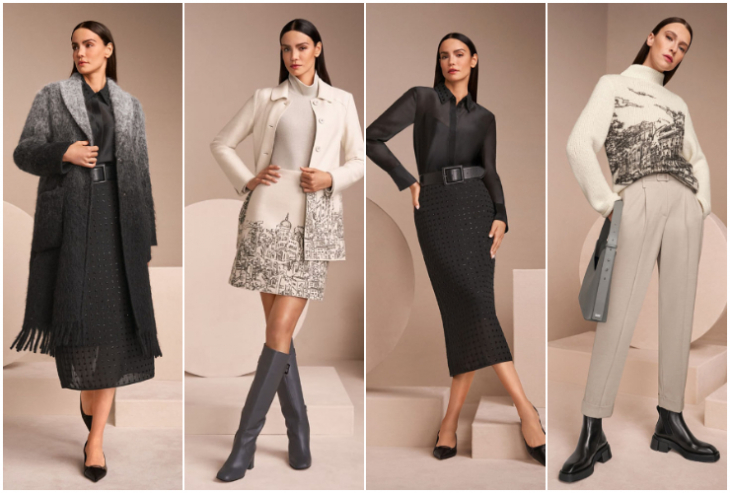 , озаглавена"City Tour", впечатлява с хармонична цветова палитра, висококачествени материи и изискан градски стил. Светъл каменен тон и топло сиво изграждат основата, подчертани с акценти в черно и тъмносив меланж.Два впечатляващи принта са в центъра на вниманието: CITY принтът, със своя артистичен почерк, наподобяващ ръчна скица, и SPRINKLES десенът, който носи фина игривост.Връхните дрехи предлагат уютни палта и рустикални вълнени дизайни с преливащи ефекти. Меланжирани платове в каменно и антрацитено сиво включват едноредни сака с колани в талията, елеци и както женствени, така и по-ежедневни костюми. Изискани тъкани "сол и пипер" с мини пайети подчертават boyfriend сака с остри ревери и прави панталони. По-непринудени визии се изразяват чрез леки плетени жилетки, комбинирани с обемни сака или панталони с широк крачол.Принтът SPRINKLES се появява върху прилепнали сака, тесни панталони, драпирани рокли и поли. Класическата валяна вълна е представена в къси якета и разкроени поли, а също и в креативни комбинации с CITY принта върху дълги якета, поли и сарафани. Линията се завършва с букле каре.CITY принтовете украсяват рокли и блузи от вискозен сатен и намачкана микрофибра, докато SPRINKLES десенът придава характер на вталени рокли и ефирни блузи. Деним в опушено сиво меланж и дръзки плитки плетки предлагат стилни и удобни визии. Уютни сиви меланжи и масивни плетки в тъмен меланж придават топлина, докато луксозните кашмирени изделия добавят нотка елегантност. Ажурни плетки с бордюрни мотиви излъчват женствена лекота.Открийте в бутика на ул. Съборна 2 или онлайн на .
