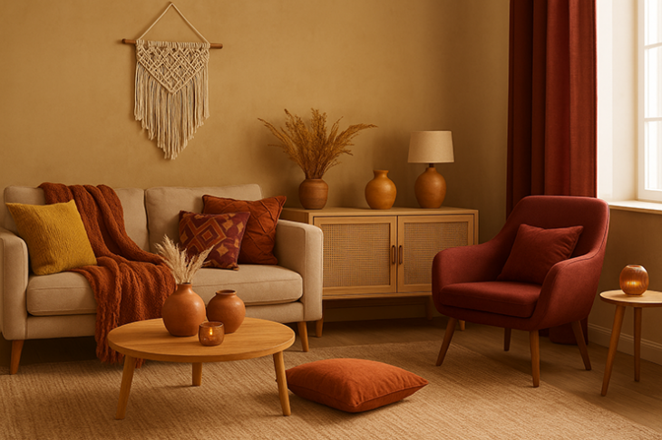 Когато навън листата променят своя цвят, а въздухът се изпълва с аромат на дърво и канела, настъпва моментът и домът ни да се потопи в същата топла хармония. Есенните цветове – златисто, охра, теракота, бордо, тъмнозелено и карамелено – носят усещане за уют, спокойствие и завършеност. Те могат да превърнат и най-минималистичното пространство в място, което „топли“ дори в най-сивите дни.Бохо стил: есенна експлозия от текстури и цветовеБохо интериорът обича свободата – смесица от шарки, естествени материи и земни нюанси. Този стил сякаш е създаден за есента. Комбинирайте топло бордо с карамелено кафяво, горчично жълто и тъмнозелено. Добавете възглавници от кадифе, плетени одеяла и етно детайли – като макраме или тъкани пана.Малките акценти, като медни фенери, глинени вази и изсушени треви, ще внесат златист отблясък и ще завършат композицията.Съвет: Не се страхувайте да „наслоявате“ – бохо стилът обича богатството на материите и нюансите.Скандинавски стил: минимализъм с топлинаСканди стилът традиционно е неутрален, но есента му придава нов живот. Вместо студеното сиво и бяло, заложете на топли неутрали – пясъчно, медено, светъл теракот. Те ще подчертаят естественото дърво и светлината в интериора.