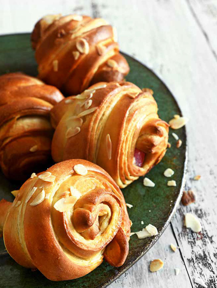 Смесете всички съставки без маслото: ако изполвате миксер, вървете от течните към сухите, а ако месите на ръка, направете кладенче от сухите съставки и добавете течните. Маслото сложете чак накрая, на порции. Щом тестото стане гладко, прехвърлете го в намаслен съд да втаса и изчакайте, докато удвои обема си. Обърнете тестото на набрашнен плот и разточете на правоъгълник. Намажете с масло и прегънете правоъгълника на две или на три и отново го разточете. С помощта на остър нож разрежете тестото на равни триъгълници. В долната широка част сложете от плънката с каквото обичате. Подредете ги в тава за печене, застлана с хартия, на разстояние една от друга и оставете настрана за 40-60 минути. Втасалите вече кифлички намажете с жълтък, разбит с прясно мляко, и печете 20-30 минути на 170°С, докато придобият златист загар. Кифличките може да бъдат напълнени с локум, мармалад, по-гъсто сладко или нещо солено. Използвайте филирани бадеми или друга поръска. Съобразете времето за изпичане с големината им.