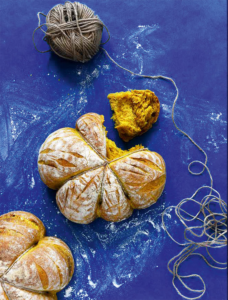 Готовото тесто обърнете на набрашнен плот и му придайте кръгла форма с въртеливи движения. Ако искате да придадете на хляба красива форма, отрежете няколко еднакви по дължина въженца от коноп и ги кръстосайте на дъното на съда, в който ще втасва тестото през нощта, след това го прехвърлете в него. Съберете краищата и ги завържете на възел, като оставите място на бъдещия хляб да порасне в тях. Приберете в хладилник. Печете на 230°С за 20 минути и на 200°С за още 20-30 минути. След изпичане срежете конопените въженца и вашият хляб „тиква“ е готов.