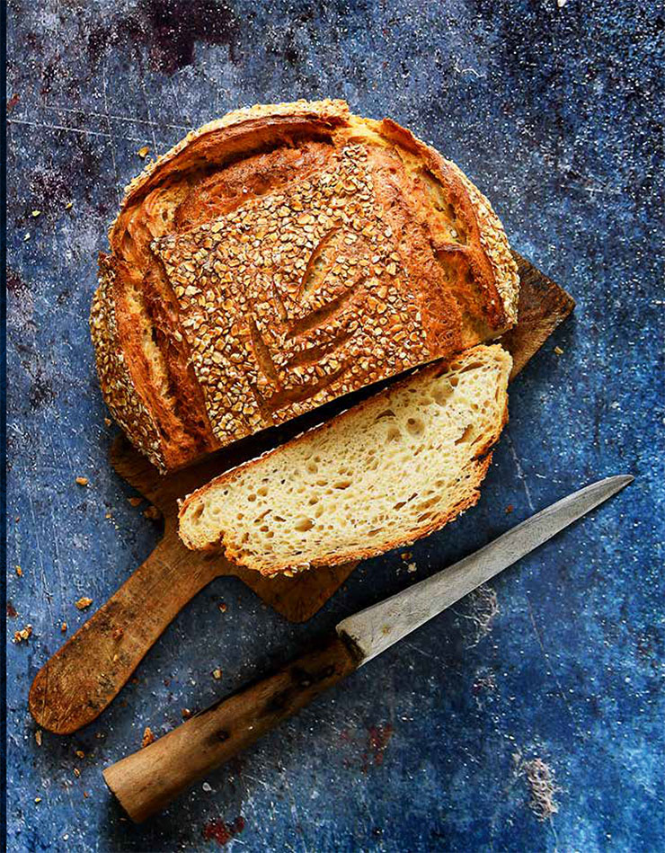 Обърнете готовото тесто на набрашнен плот. Окръглете го, напръскайте с вода и оваляйте в овесени ядки, после прехвърлете в кръгла форма за втасване. Приберете за през нощта в хладилник.