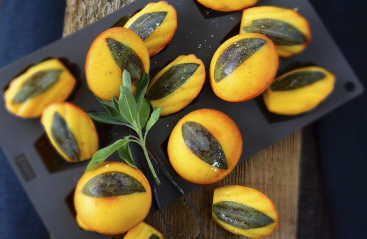 Тези фини хапки са сред десетте най-популярни френски десерти. Характерната им форма на мидена черупка с издутото гръбче ги превръща в истинско бижу, което грабва вниманието и радва сетивата, а и оставя вкусни спомени.Предлагам ви идея за солени мадлени с полента, пармезан и градински чай, които са прекрасни за споделяне на красива и дълга вечер в хубава компания и добре изстудено вино.Използвах 55 г полента, 2 с. лъжици брашно, 1/4 ч. лъжичка сода, 40 г фино настърган пармезан, 20 г масло, разтопено, 1 яйце, 80 мл прясно мляко, сол, черен пипер, листа от градински чай, допълнително пармезан за сервиране.