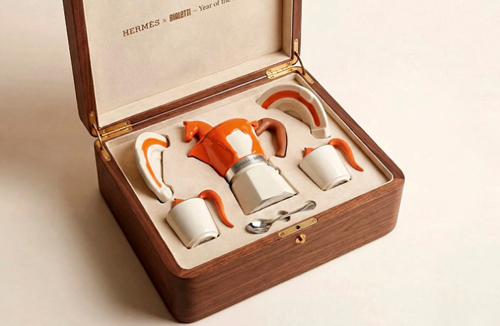 Вдъхновена от Годината на коня, дизайнерката Джейн Морели пренася една от най-разпознаваемите икони на дизайна – кафеварката Bialetti Moka – в естетическия свят на Hermès.Концепцията поставя акцент върху идеята за символично „преосмисляне“ – как един ежедневен предмет може да придобие ново присъствие чрез цвят, силует и характерни акценти.Дори чашата и чинийката следват тази логика, превръщайки сервиза в малък сценографски детайл, където естетиката на Hermès и символът на годината намират общ визуален език.Проектът съществува все още само във виртуалното пространство, но ние с интерес следим дали ще има проявление в реалността.